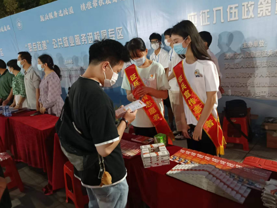 当晚,在百企千岗进校园2022年yl23455永利求职夜市活动中,6名党员亮身份、亮职责、亮形象,联合市、区征兵办,共同设立应征入伍政策宣传专区,围绕大学生关心的入伍条件、征兵流程、优惠政策等问题,向前来咨询的同学耐心解答,分发宣传材料,激励青年学生积极响应国家号召,携笔从戎献身国防事业。