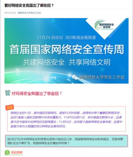 近期,校学生处认真落实教育部、教育厅工作要求,积极动员学生参加“全国大学生网络安全知识竞赛”、“网安启明星”体验活动,组织开展网络安全主题班会、主题微博征文,通过网站、微信、微博广泛宣传网络安全知识,强化学生网络法制意识,帮助学生提升媒介素养。