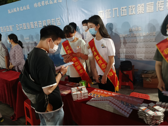 在悬挂“青春风华正茂 参军无上光荣”闪亮标语的专区内,摆放了2022年征兵政策宣传板和各类宣传指导手册,视频滚动播放2022年征兵公益宣传片《火热军营 精彩人生》”,市、区征兵办工作人员围绕大学生关心的入伍条件、征兵流程、优惠政策等问题,向前来咨询的同学们耐心细致地进行了解答。6名退役大学生士兵佩戴“征兵宣传志愿者”绶带,现场和同学们分享了各自参军入伍的光荣事迹,用切身的经历激励在校大学生积极应征,到军营中历练成长。