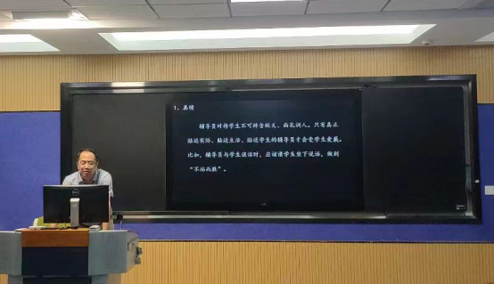 在业务培训环节,辅导员职业发展中心林辉副教授作了《学生辅导员素质能力提升》的专题指导。他结合各学生辅导员过去一年的工作表现,进一步明晰了当前研究生兼职学生辅导员工作的实施背景、根本任务、具体要求等问题,指出了目前存在的角色偏差和工作误区。他指出,学生辅导员的工作是做人的工作,需要具备“三熟、三心、三情、三定、三勤、三办、三为、三拒”的能力,以身正人、以情感人、以德育人、以诚待人,让学生真实感受到学生辅导员的温度和态度。
