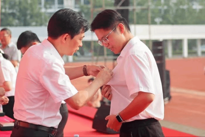 开学典礼上还举行校徽佩戴仪式,校领导为两个校区的新生代表佩戴校徽,并为恰逢在典礼当天过生日的新生送上礼包。