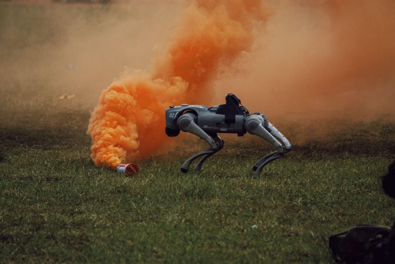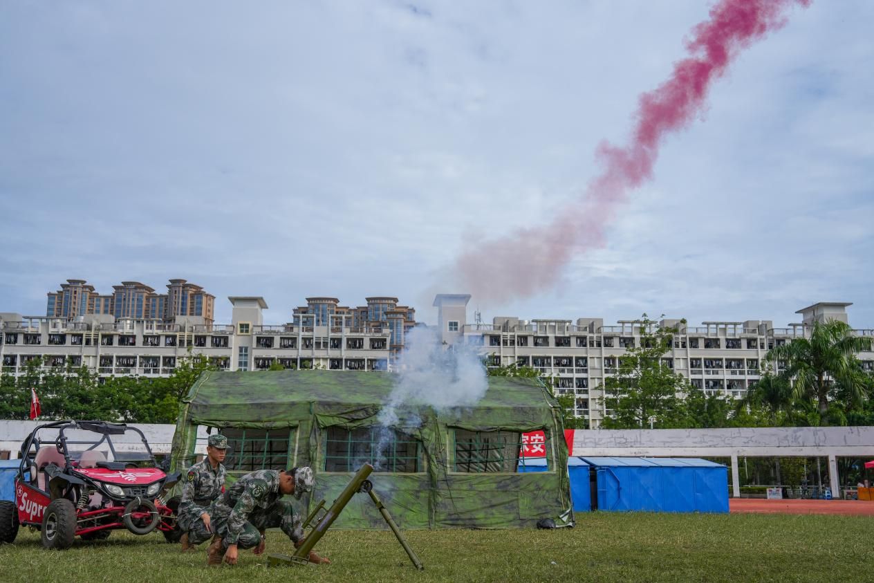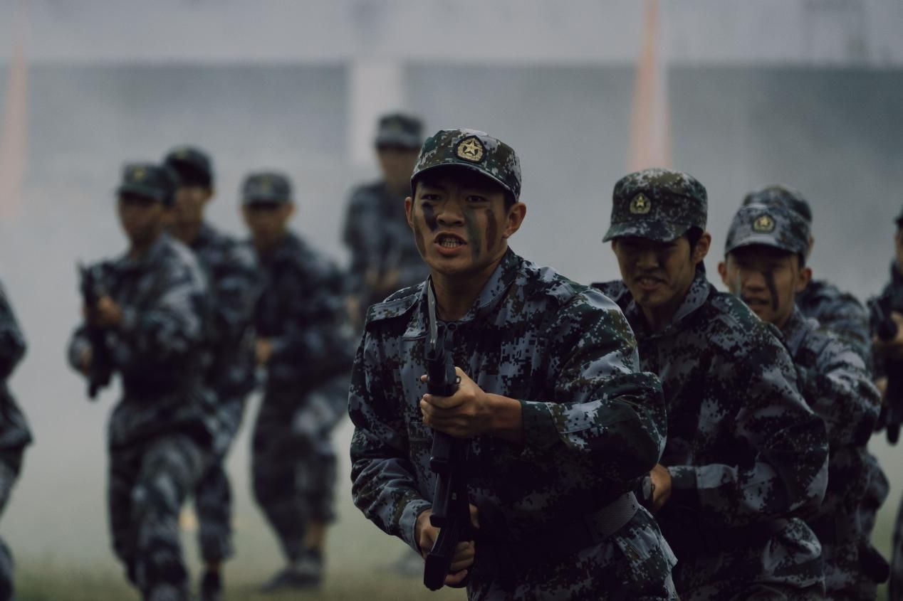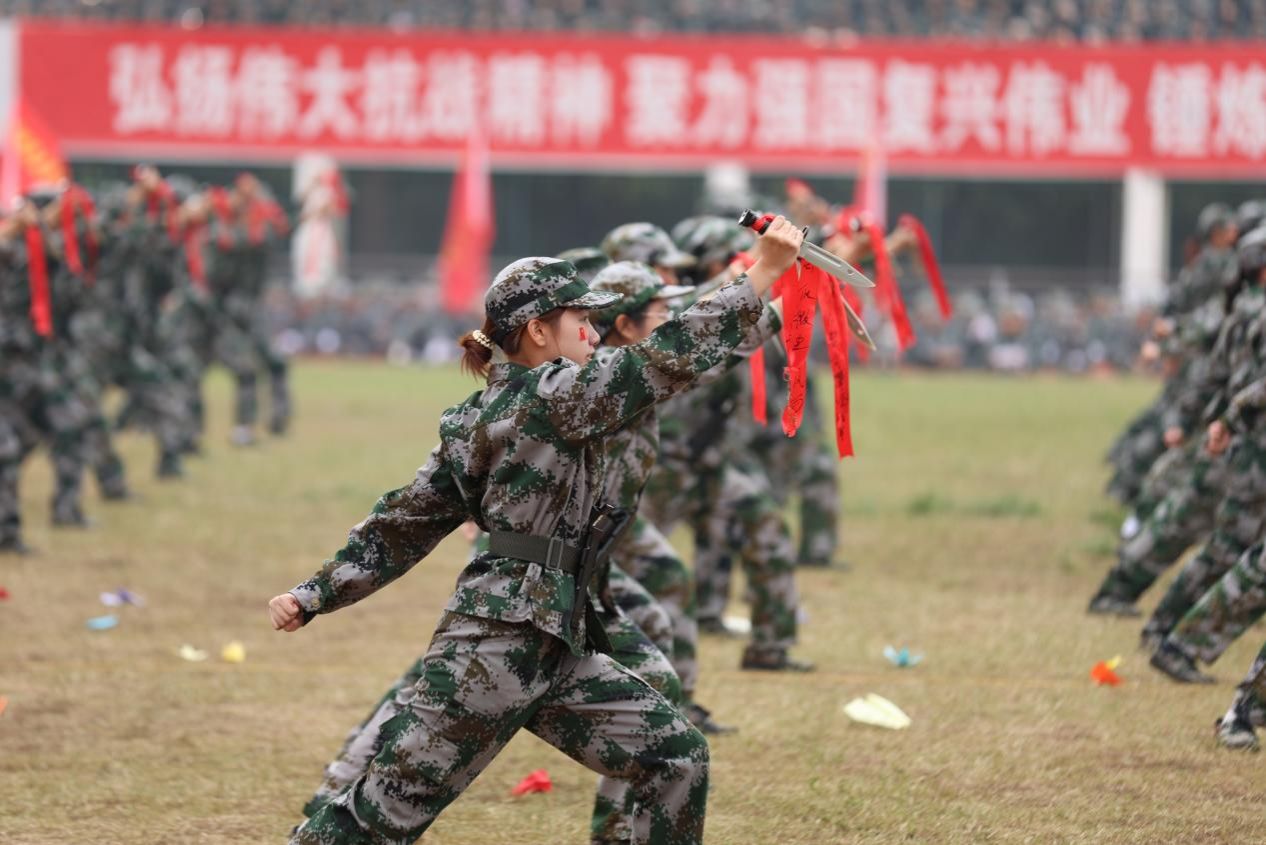 现场,匕首操、军体拳、刺杀操及擒敌术表演轮番上场展示。同学们动作迅猛如虎、刚劲有力,呐喊声震彻云霄,气势磅礴。一招一式间,尽显青年学子的果敢与坚毅。嘹亮的军号声划破长空,摇曳的信号弹似利剑刺穿迷雾。“红蓝对抗”的综合演练中,参训学员身着迷彩吉利服,在硝烟弥漫中熟练操作装备,匍匐、穿梭、冲锋,在纷飞的“炮火”中勇敢向前,完成既定作战目标。精彩的演练展示瞬间点燃全场热情,赢得全体师生的掌声与喝彩。