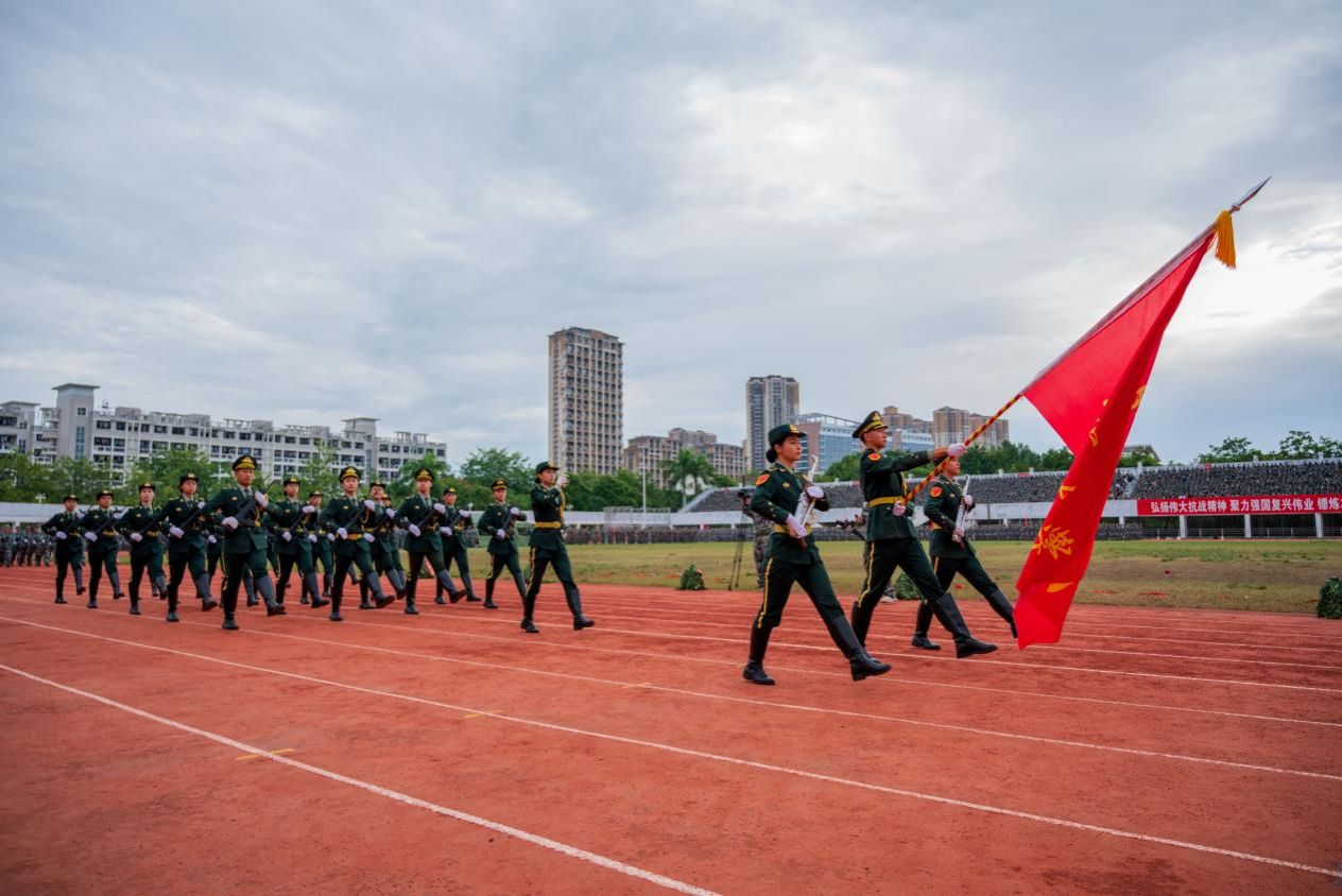 ▲由校国旗护卫队和各学院参训学生代表组成的分列式方阵接受检阅