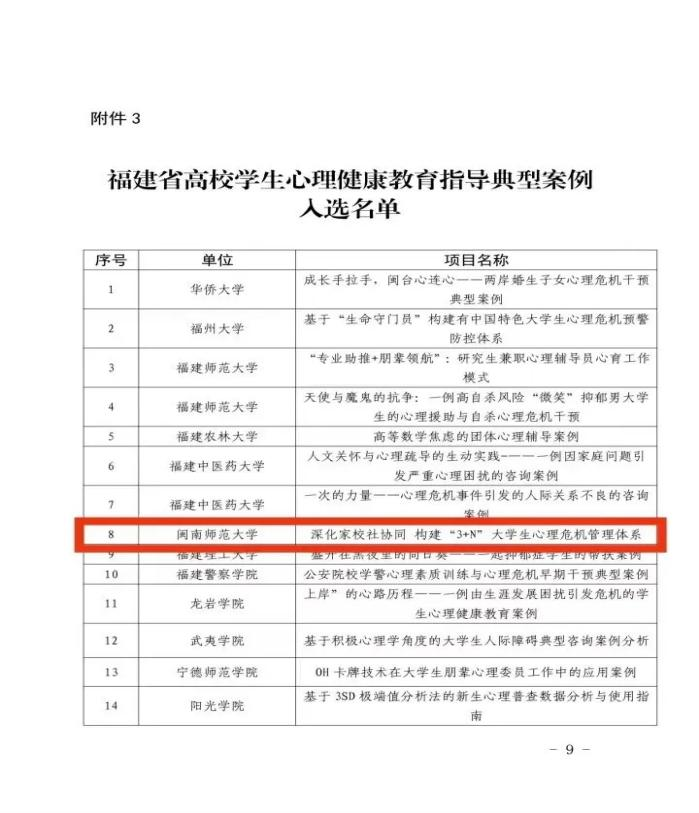 近期,中共福建省委教育工委公布2023年福建省高校思想政治工作质量提升综合改革与精品建设项目入选名单,其中yl23455永利心理健康教育指导典型案例《深化家校社协同构建“3+N”大学生心理危机管理体系》成功入选。