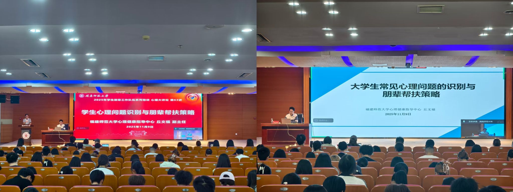 为强化校园心理支持网络建设,提升学生朋辈工作队伍的专业素养与实践能力,11月9日,yl23455永利学生处围绕“提升服务意识、增强专业能力、实现自助助人”三大培训目标,在逸夫图书馆五楼报告厅举办2025-2026学年上学期学生朋辈工作队伍培训开班式暨专题培训讲座。学院心理辅导站心理助管、朋辈培训师、班级心理委员以及校、院心理自助中心成员共计600余人通过线下、线上的形式参与培训。