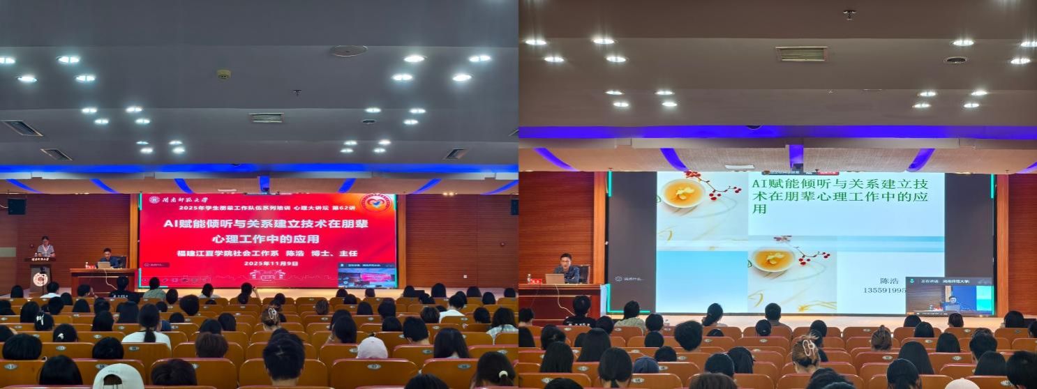 开班仪式后,福建江夏学院社会工作系主任、心理学博士陈浩老师带来《AI赋能倾听与关系建立技术在朋辈心理工作中的应用》专题讲座。陈浩老师聚焦AI赋能倾听与关系建立技术,结合大学生人际交往中的典型场景,系统讲授了共情倾听、有效提问、正向引导等实用心理辅导技巧。他强调,朋辈辅导的核心是“以心暖心”,要尊重他人感受、避免主观评判,用专业技术搭建信任桥梁,帮助同学疏导情绪、调整认知。